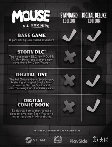 游戏《神探杰克鼠》的购买建议如下:PC端Steam版本的性价比最为突出,其中标准版定价95元,豪华版128元,包含DLC、原声音乐以及漫画内容;主机数字版的价格区间则在215至285元左右。对于普通玩家而言,PC标准版是合适的选择;若玩家有收藏偏好,可考虑PC豪华版;而对于追求极致收藏体验的硬核玩家,实体豪华版会是更优的选项。