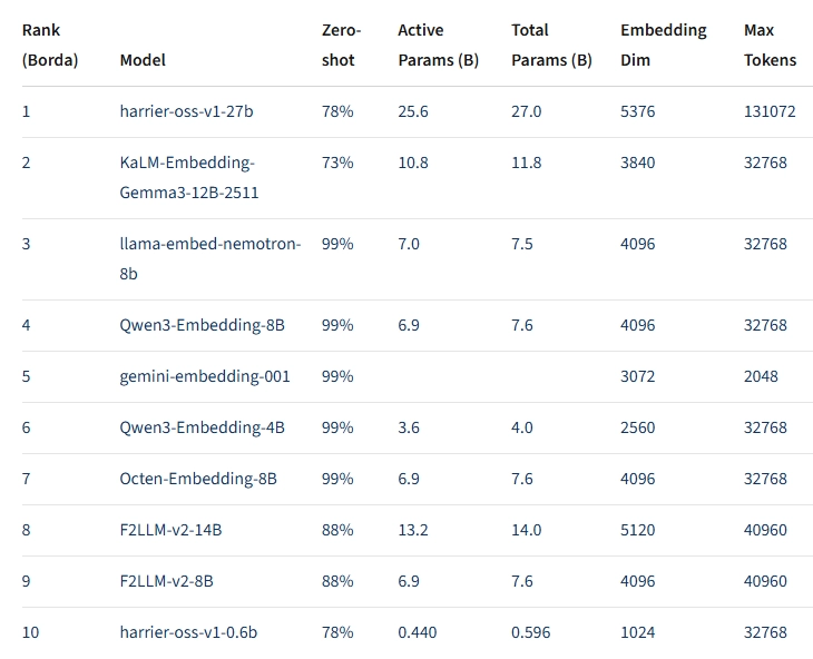 Microsoft旗下的Bing团队推出了名为“Harrier”的开源嵌入模型。该模型支持一百多种语言,拥有32000个令牌的上下文窗口,其训练数据涵盖超20亿个实例以及GPT-5生成的合成数据。据团队介绍,Harrier在多语言MTEB v2基准测试中表现领先,并且性能超过了OpenAI与亚马逊的专有模型。