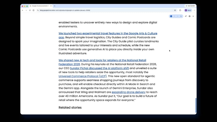 尽管Chrome此前已具备该功能,但此次更新进一步优化了阅读模式并提升了其可见性,能快速将图形繁多的页面转化为简洁的文档视图,而不像旧版本那样是在侧边面板中打开的。