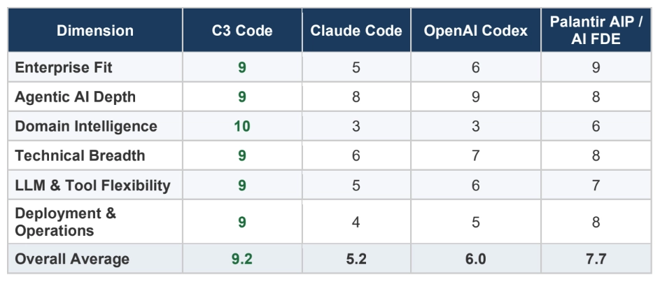 公司借助Anthropic PBC的Claude开展独立评估,其结果对公司的主张形成了支撑。此次评估把C3 Code的应用程序生成能力,同OpenAI Group PBC的Codex(6.0)、Palantir Systems Inc.的AIP(7.7)等模型展开了对比。其中,C3 Code在“领域智能”这一维度表现格外突出,获得了10分的满分成绩。