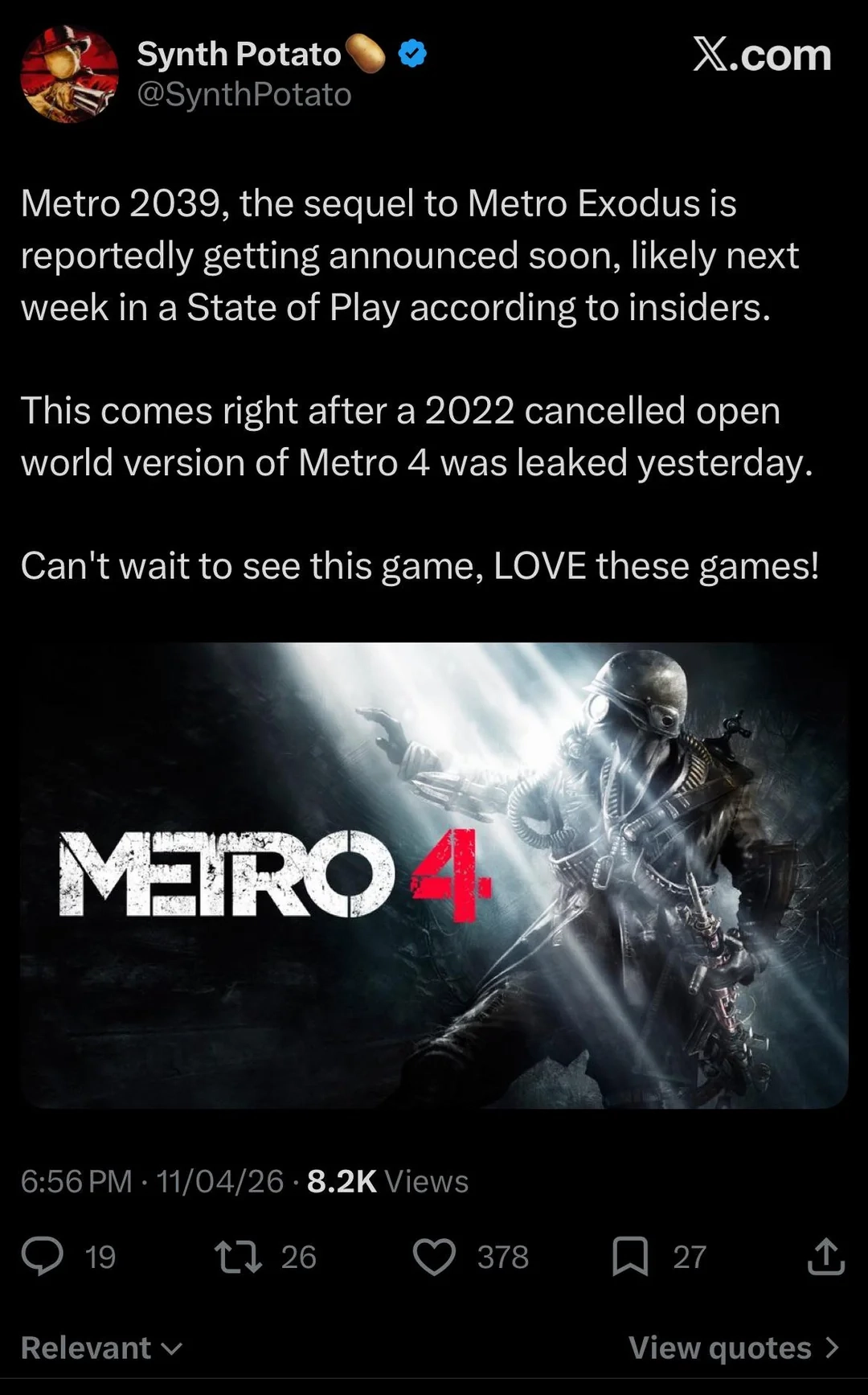 然而,目前已有一款由4A Games在2022年取消的《地铁》系列游戏《地铁4》的可玩版本在网上泄露,据推测,4A Games可能是放弃了这个版本,转而开发《地铁2039》。