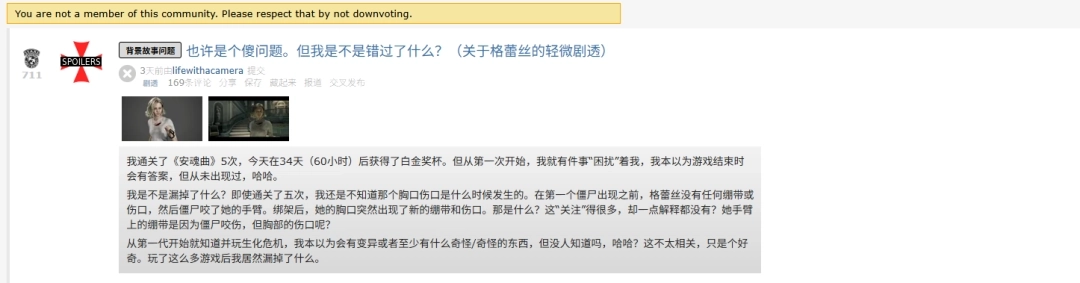 该用户表示,从第一次通关起这个细节就一直让他感到困惑,他原本期待游戏结局能给出解释,可始终没有等到。游戏前期格蕾丝被丧尸警察咬伤手臂后缠上了绷带,不过在被反派维克多绑架、在医疗中心醒来后,她的胸部多了一块新的、沾满鲜血的绷带。在之后的整个游戏流程里,游戏对这处伤口始终没有任何说明,格蕾丝没提过,剧本也没有任何暗示,过场动画更是表现得好像玩家本来就该知道绷带的来历一样。