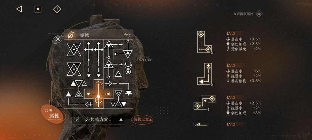 共鸣的摆放方式如图所示,共鸣的调频需选择“赤诚”这一选项。