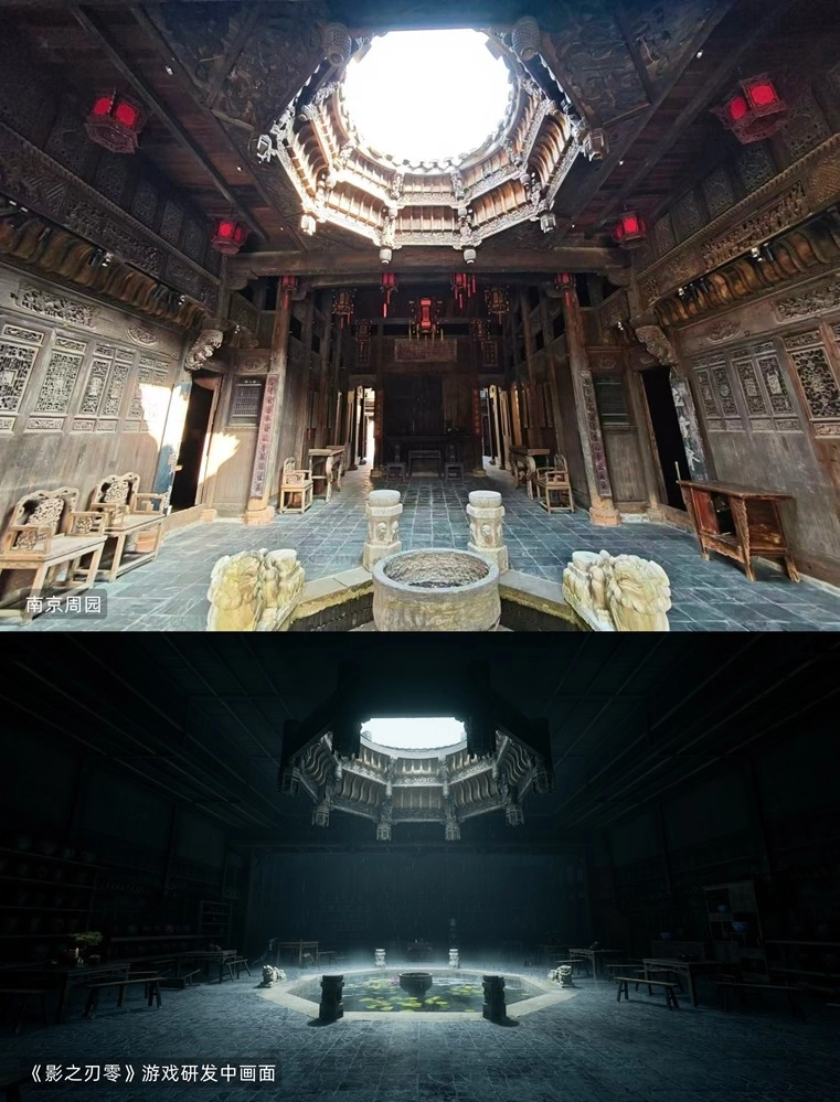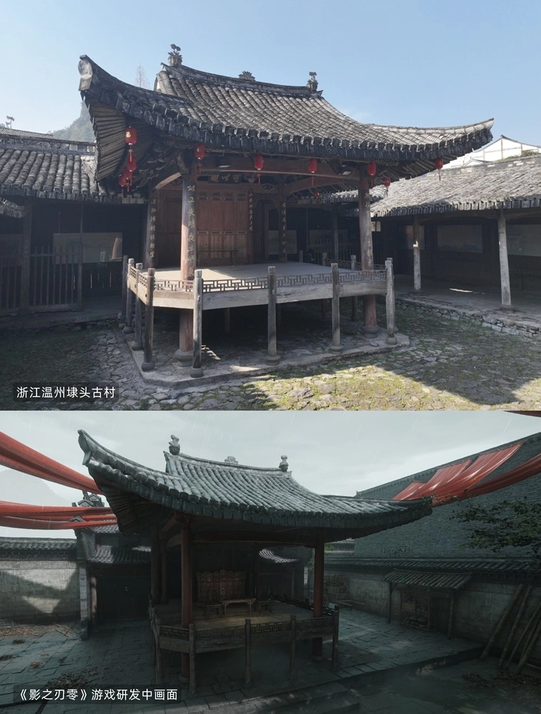 《艺术学研究》在专题里把《影之刃零》的游戏场景建模和现实文旅景点放在一起做了对比。江南古村落的戏台、苏式园林的天井院落、北京首钢园区的工业遗迹……这些分布在中国各地的真实空间,经过游戏团队灵游坊(S-GAME)的艺术化再创作,变成了《影之刃零》里“影境世界”的独特场景。