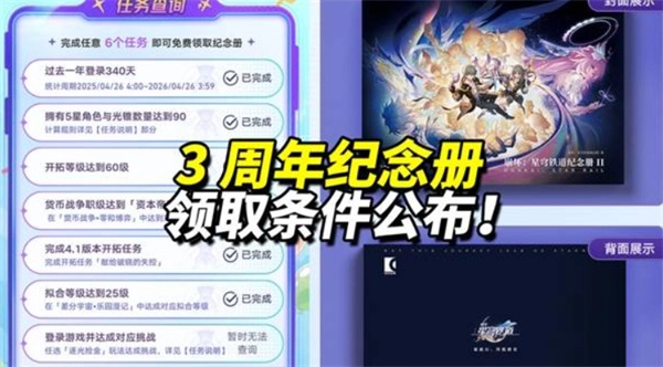 累计完成6个任务后即可免费领取《崩坏星穹铁道》纪念册Ⅱ*1。