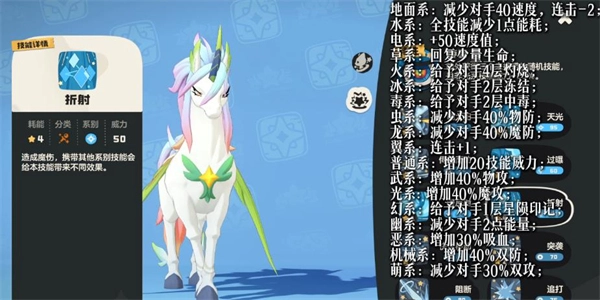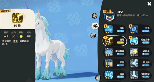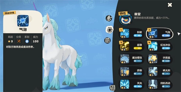 5、技能搭配方面,独角兽的核心玩法是通过首领化解锁7个技能栏位,再借助折射技能获取六次增益效果来大幅强化自身,因此折射作为核心强化技能是必带的。其次,水系的气泡技能能为自身降低技能能耗,有效缓解独角兽技能能耗较高的问题——毕竟它的技能耗能大,若不带气泡,可能释放两次技能就会面临能量不足的情况,所以气泡技能也推荐携带。