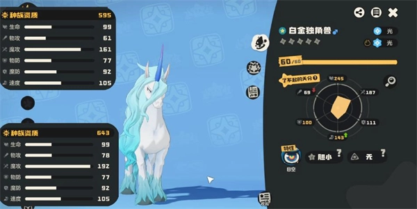 4、白金独角兽的种族值中,魔攻数值极高,但生命与双防偏低,整体较为脆弱,这恰恰符合它“玻璃大炮”的特性。正因为它身板较脆,在PVP对战里速度就显得尤为关键,性格方面建议选择能降低物攻、提升速度的胆小,个体值则推荐优先刷速度、魔攻和生命。