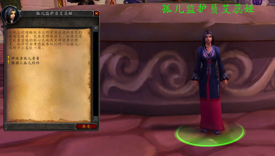这是最后一条任务线(要求角色等级达到70级),勇士们依旧可以前往达拉然,找到【孤儿监护员艾蕊娅】接取这条主线的起始任务。任务涉及神谕者孤儿鲁鲁和狼獾人孤儿科科两个选择,但需要注意的是,这两个任务只能选择其中一个来接取~