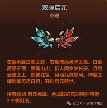 迷雾大陆这次更新里,最让小编感兴趣的就是新翅膀双耀启元啦。单看外观或许没法一下子抓住大家的眼球,但它附带的效果绝对会让你惊讶——合成彩虹石的时候能额外多拿2个!要是你还在纠结要不要入手,不如先看看小编的分析再做决定吧!