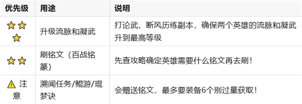 可以先把「新手历程」和「琨梦诀」这两个任务完成,它们会给凝武突破材料、铭文这类关键资源!建议先把这些资源领完,再去用体力,这样能避免浪费!