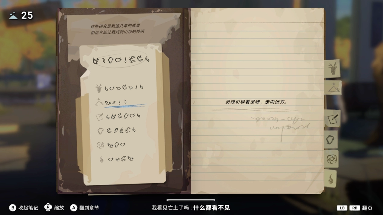 所有收集到的要素与解读内容,都会完整记录在游戏内的相簿中。这里收录的品类十分丰富,并且不少内容的解读之间存在连锁关联——刚开始接触游戏时,你可能会觉得有些无从下手,但随着可解读的内容慢慢积累,游戏的故事脉络与世界观背景才会逐步清晰地展现出来。从设计角度来看,相机这一载体不仅承载着“记录”这一行为本身,更暗含着对那些已然失去或即将消逝之物的留存;而神火文的设计,也与灵魂、生命或是火焰的象征意义相契合,这恰好与《OPUS:心相吾山》所探讨的“爱、灵魂与自我完成”的核心主题不谋而合。