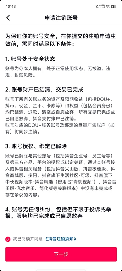 6、当满足账号安全、财产已清空、其他登录或绑定关系已解除、无纠纷投诉举报等注销要求后,点击“下一步”。