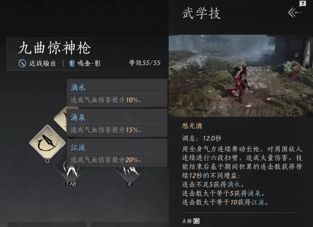 在释放Q技能后,会根据释放Q技能期间累积的连击数获得不同的伤害加成。也就是说,当你释放Q技能时,神龙吐火的爆燃效果也在累积连击数,最高十道连击就能叠满江流的增益效果。
