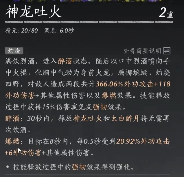 神龙吐火命中目标后会触发爆燃效果,每0.5秒造成一次带有攻击判定的伤害,这是九曲流派下的Q武学技。