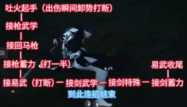 按Q键衔接枪系武学——按1键衔接回马枪招式——按R键进行枪蓄力,完成一半蓄力时——按tab键切换易武技并快速按E键打断当前动作——按Q键衔接剑系武学——按~键使用剑特殊技——按R键将剑蓄力完全释放——按tab键切换易武技。