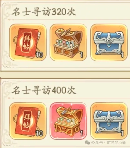 400个寻访拜帖可兑换寻访拜帖×10、金色稀有名士自选箱×1与白银宝箱×1