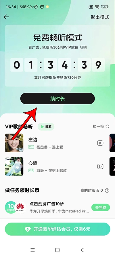 另一种是需要办理VIP才能收听的歌曲,若想激活“看广告免费听歌”的权益,就得先点击一首标有VIP标识的歌曲。