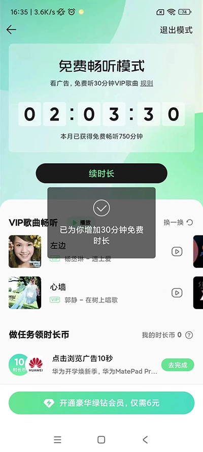 当弹出的界面显示“恭喜你,可免费听歌30分钟”时,即表示权益领取成功,用户在收听VIP歌曲时,将消耗这30分钟的权益。