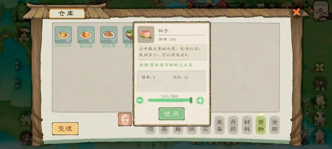 这时我们就有了400个桃子,这些桃子是可以直接吃的。我们打开仓库,点击使用食物来食用桃子,直接拉满,把桃子全吃掉。当然,你也可以省着吃,比如把桃子放到家宴上之类的。