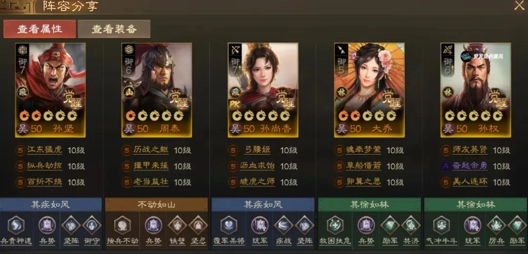这套阵容由孙尚香、孙坚、周泰、大乔和孙权组成,核心输出点是孙尚香,孙坚负责控制敌方,周泰承担保护队友的职责,大乔提供治疗续航,孙权则为孙尚香叠加增伤效果。只要能确保孙尚香的生存,队伍整体输出能力相当可观。