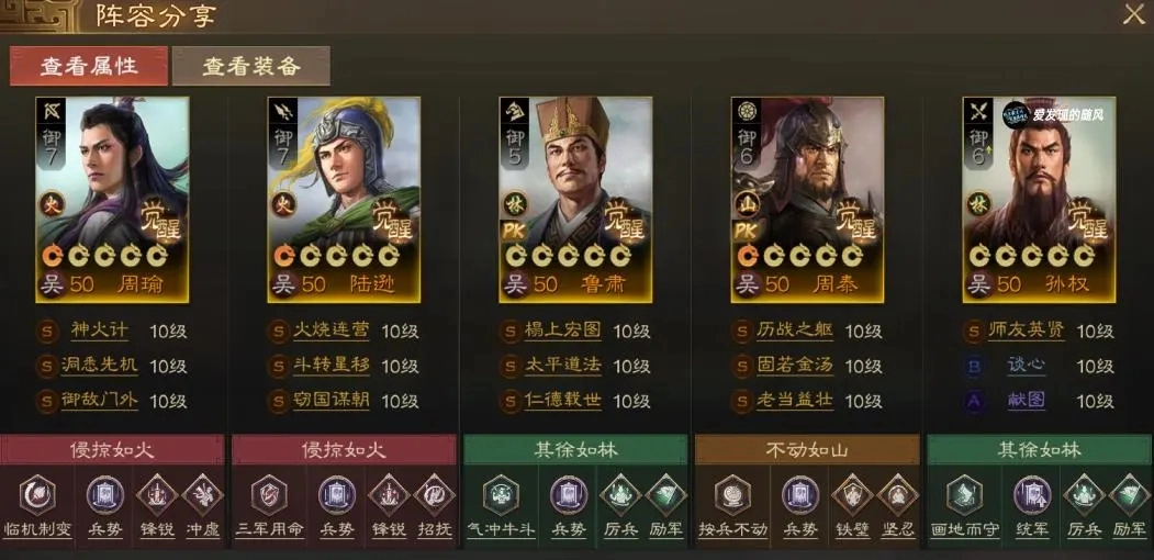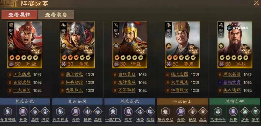 这是一套比较成熟的阵容了,陆逊的位置也能换成吕蒙,两者差异不大,一个更偏向坦度,一个则擅长卡位。陆逊的“斗转星移”战法可以替换为“士别三日”或“百折不挠”等。孙权的“献图”可以升级为“美人连环”,如果对战环境中魏延较多,弓兵单位都换成“连弩之车”就可以了。