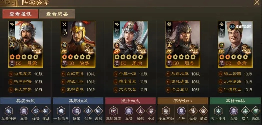 搭配徐盛的话,三个输出位的伤害会更上一层楼。在多输出的阵容里,徐盛带瞒天过海效果很好,尤其打肉盾的时候特别管用。前期对方坦克还没倒下时,可以让带了瞒天过海的徐盛再动一次,这样下回合他还能再放一次瞒天过海,对方坦克基本扛不住这波伤害。吕蒙先出手卡位,最后由SP周瑜完成收割。