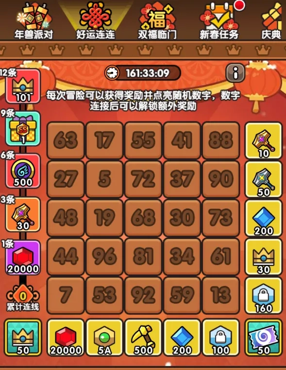 因为数字允许重复点亮,这个活动其实特别考验运气,而且只有大保底机制——也就是积累150到160个道具时必然能全部点亮,但要是没攒够这个数量,能连出几条完全得看运气,所以我们的建议是:这个活动要么不氪金,要么就直接拉满。