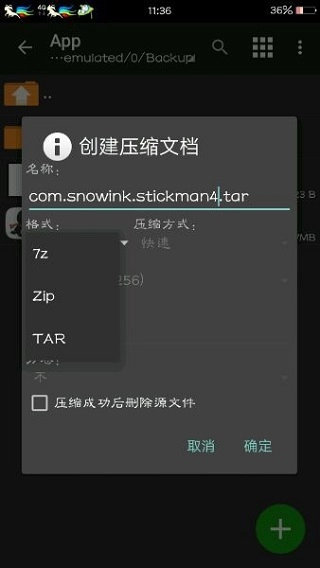 6、打开ZAchiver,先将原tar格式的压缩包重命名,复制其名称后即可删除该压缩包;接着长按修改后的data文件,选择“压缩…”选项,压缩格式保持为tar。