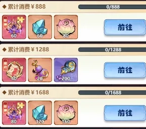 这里的核心是会心法宝,累计消费388就能拿到本体,其余的都是碎片奖励。如果消费达到1688的满额,就能获得一个会心法宝本体、140个碎片以及75个万能元神。