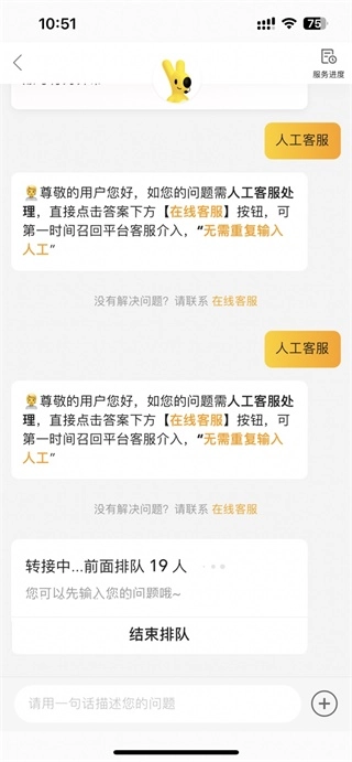 5、输入“在线客服”,选择“联系客服”选项,接着进入排队流程
