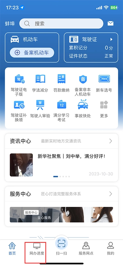 1、第一步打开交管12123应用,进入首页后点击【网办进度】选项;