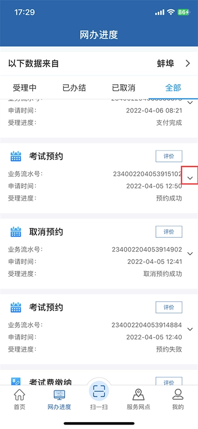 2、接着在网办进度页面里点击【向下的箭头】;