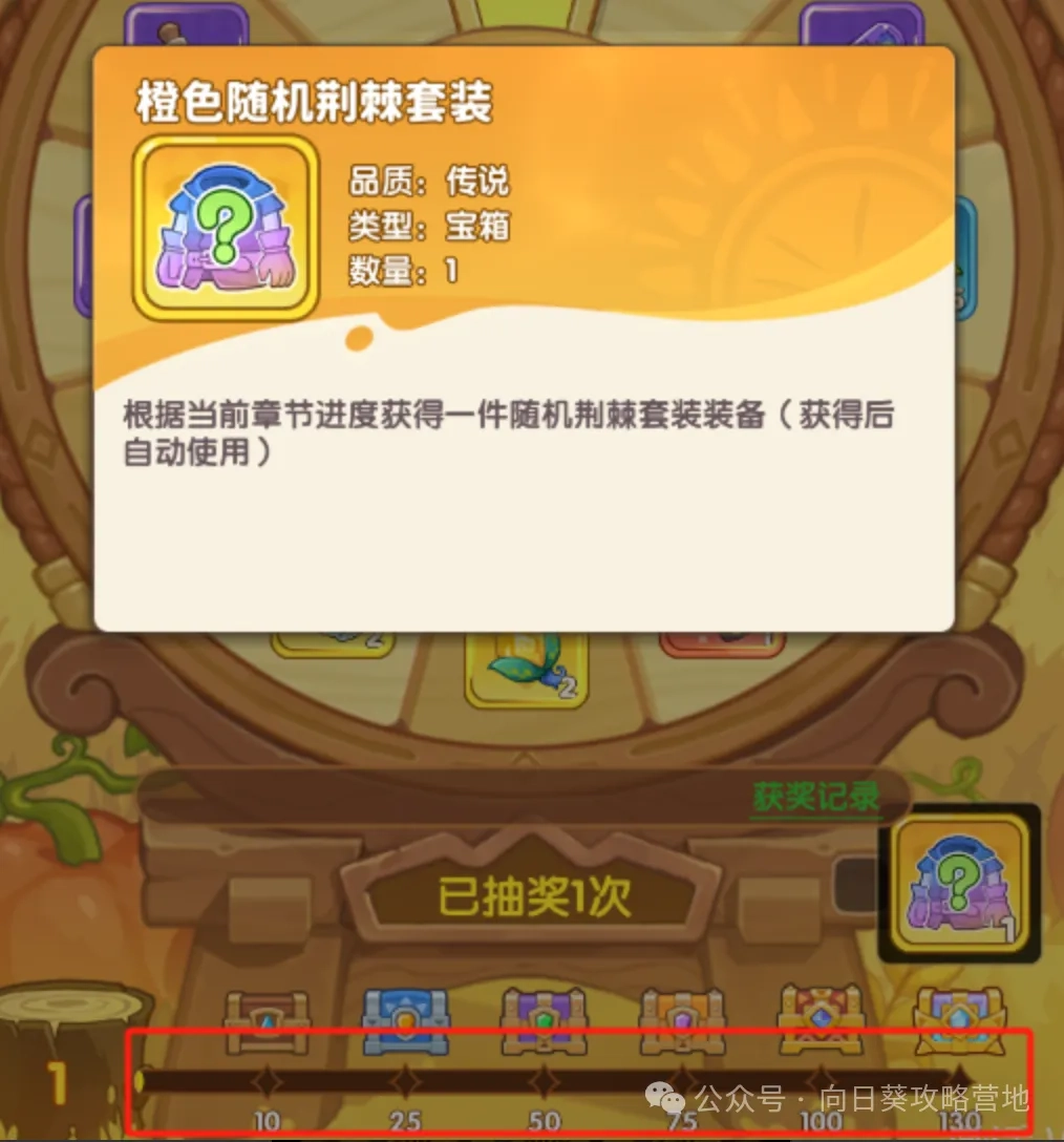 除此之外,还设有一项奖励机制:累计抽奖达到130次,即可获得随机橙色荆棘套装装备。