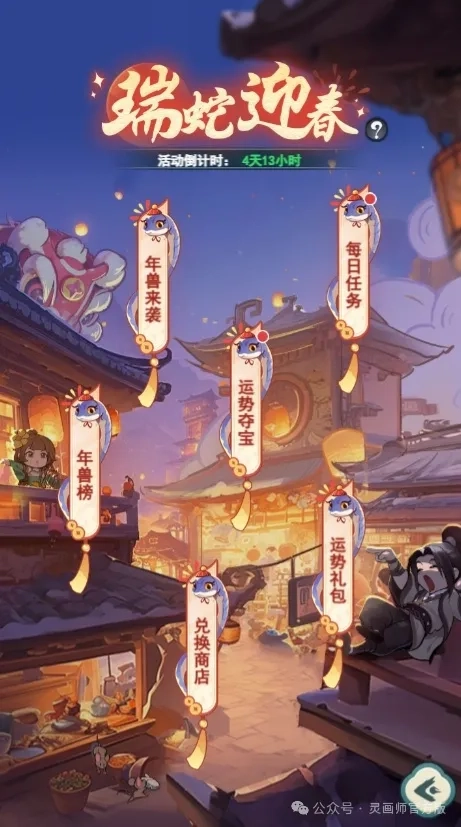 ·瑞蛇迎春活动期间,道友通过完成活动每日任务及参与年兽来袭、运势夺宝等玩法,可获取大量花灯;