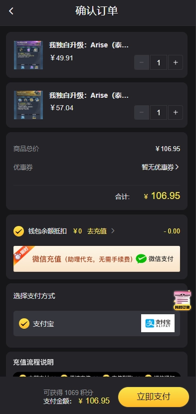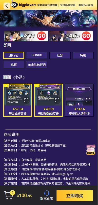 1、点击上方链接,进入《我独自升级:Arise》代充页面,选定需要充值的面额与数量后,点击“立即购买”按钮;