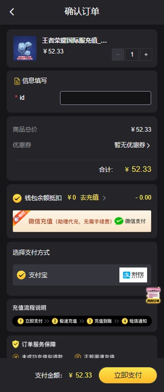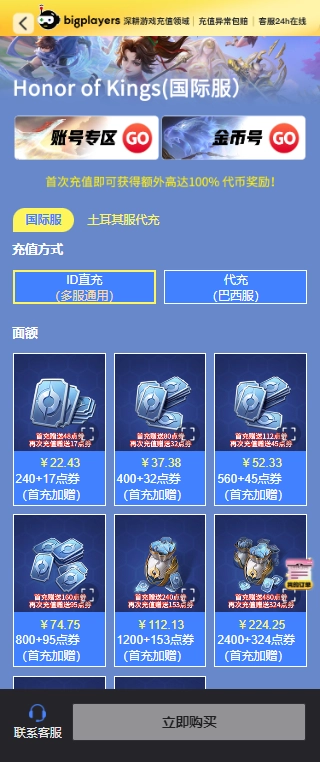 1、点击上方链接,进入王者荣耀国际服代充页面,选好要充值的面额和数量后,点击立即购买;