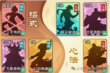 幻剑神通、三千情丝、万象更新(招式),穿云破浪、万剑归一、北冥游鱼功(心法)