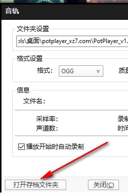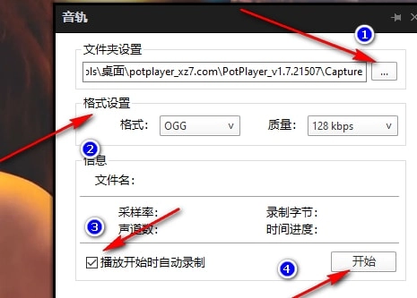 4、第四步,打开声音录制选项后,在音轨页面里设置好文件的保存路径和格式,也可以勾选“播放开始时自动录制”选项,最后点击“开始”按钮就可以了。