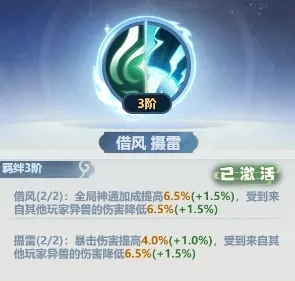 此外,相同属性的异兽一同上阵还能触发元素羁绊效果。比如风属性异兽组合能激活“借风”羁绊,带来全局神通加成;火属性组合触发“坐火”,提升会心伤害;雷属性组合则触发“摄雷”,增加暴击伤害。另外,我们也可以采用2+2的异兽属性搭配方式,这种情况下对应的两种元素羁绊都能生效。