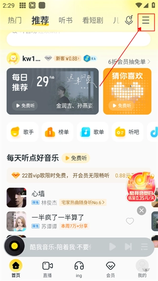 1、点击手机酷我音乐右上角的【菜单】按钮