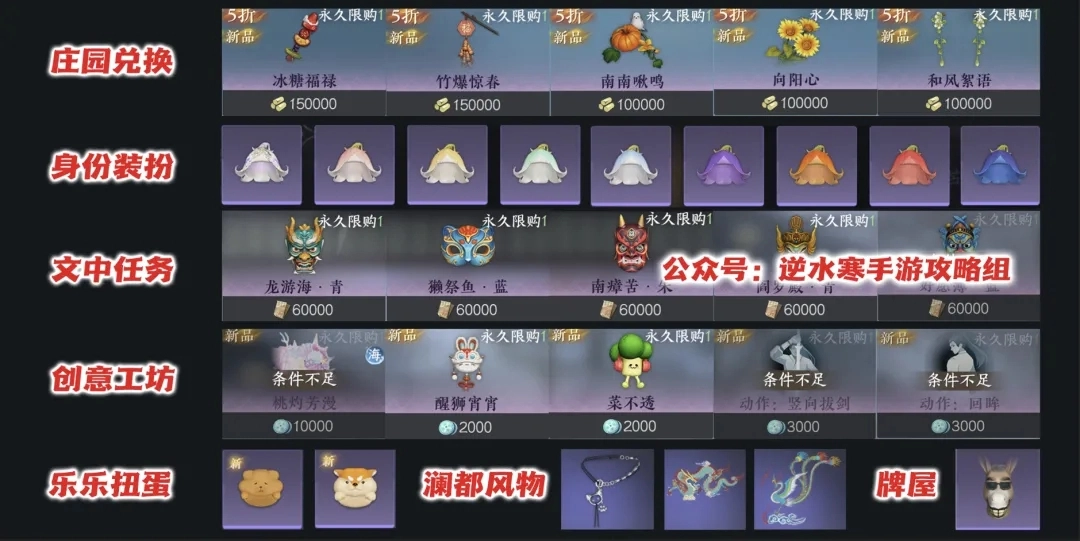 逆水寒手游2.3.1版本更新后,各大商店都上架了全新商品。为了避免大家错过奖励,本期攻略整理了各商店新增的商品种类,方便大家查漏补缺,没买全的小伙伴对照下图参考就可以啦!