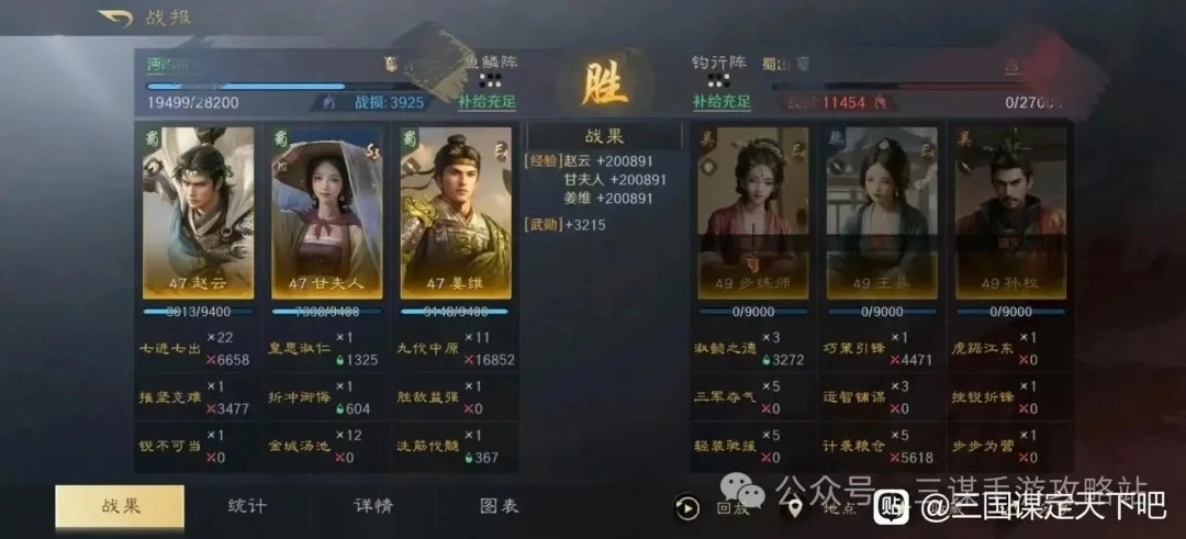 这场对战赵甘姜的战斗,我带了步练师和孙权,这套阵容应该是参考了上赛季藏书阁里的吕蒙队伍。不过作为追击队,整体上被赵云克制,所以最终落得惨败的结局。