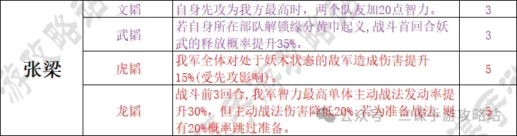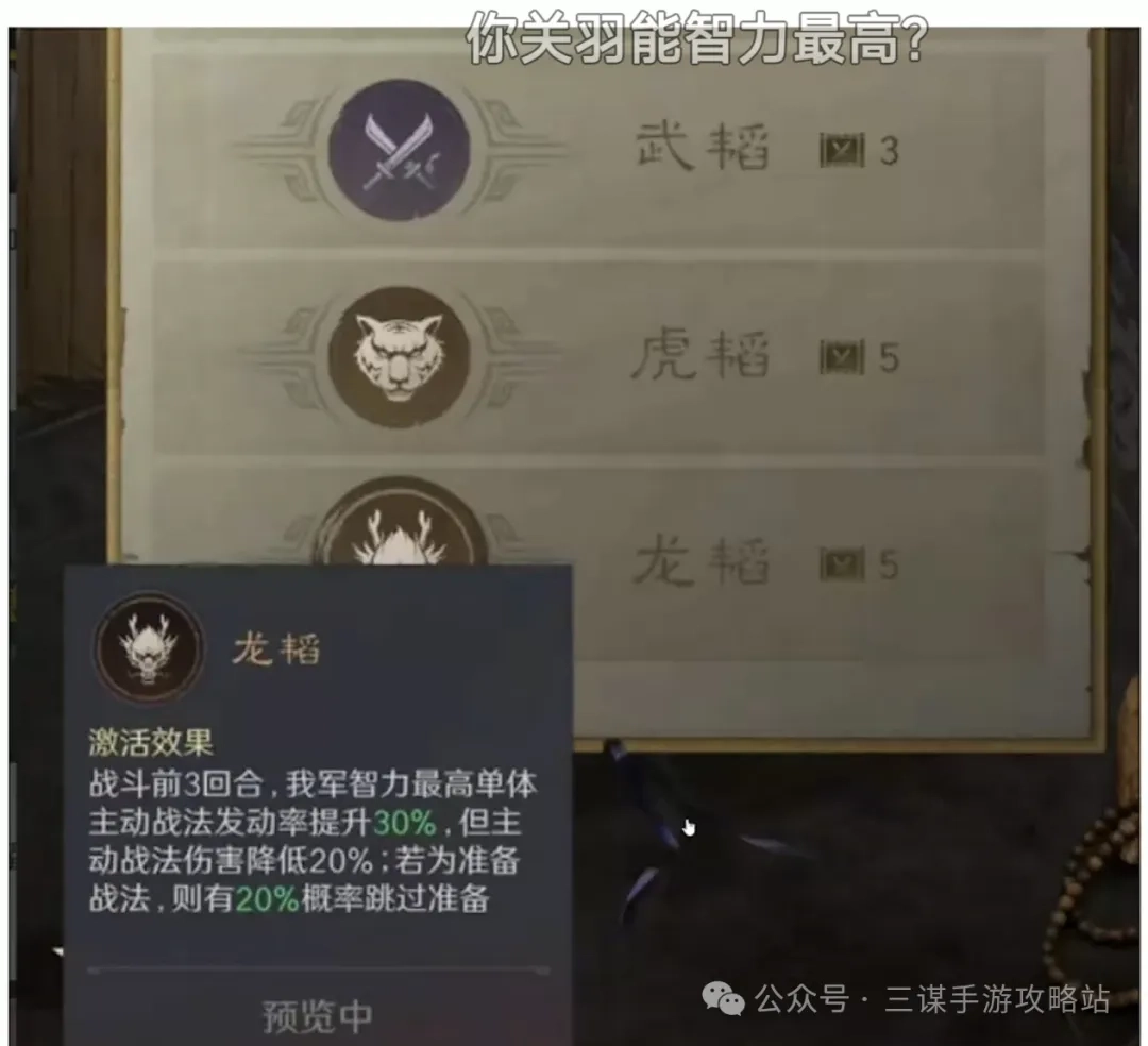 龙韬:这主要是为张角准备的,叠加之后能让张角在前三个回合里,战法的发动率和跳过准备回合的概率都能达到90%。