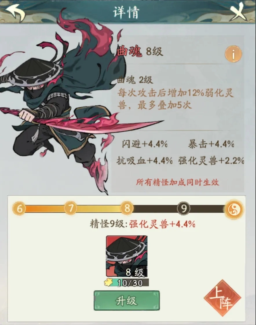 回魂:每次攻击后使灵兽弱化效果提升12%,该效果最多可叠加5层。