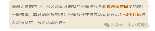 据官方说明,合区活动的坐骑与神兵均和珍奇商店保持同步,其中非联动版权的神兵及坐骑,会在相应活动结束后的1至2个月内加入珍奇商店。