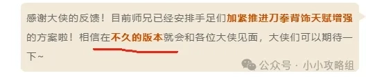 目前所有背饰天赋里,剑系的三个(像玄护、清霜)是最强的。相比之下,刀和拳这两个职业的背饰天赋很少有人用,尤其是拳系,已经弱到不行了。玩家一直呼吁加强,这次总算有消息了——不过要说明的是,这次调整的是背饰天赋而非职业本身,后续增强后对职业会不会产生影响,还得看实际情况。