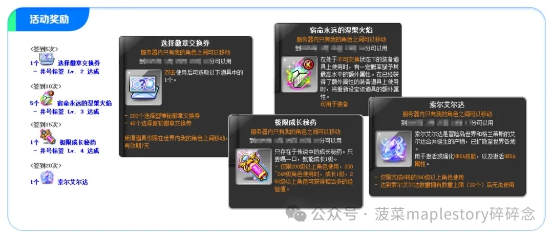 2、该活动的签到次数奖励:主要是一些常规材料以及250个升级药