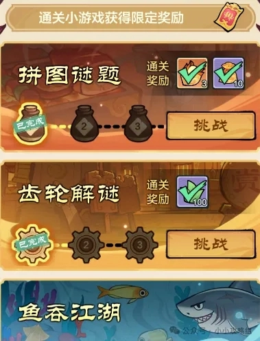 玩法很简单,包含拼图、拼齿轮和大鱼吃小鱼三种形式,每种玩法都设有不同的关卡,完成每一关都能得到相应奖励。当所有关卡都通关后,就能获得丹火契,用它可以去秘宝商店兑换道具。