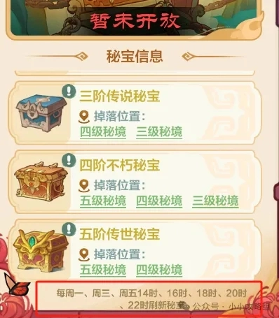 占领秘境秘宝能获取大量丹药,每个秘宝都有其对应的掉落位置,大侠们只需在开放时段(周一、周三、周五的14点、16点、18点、20点、22点)前往对应的秘境找到秘宝并进行占领即可。