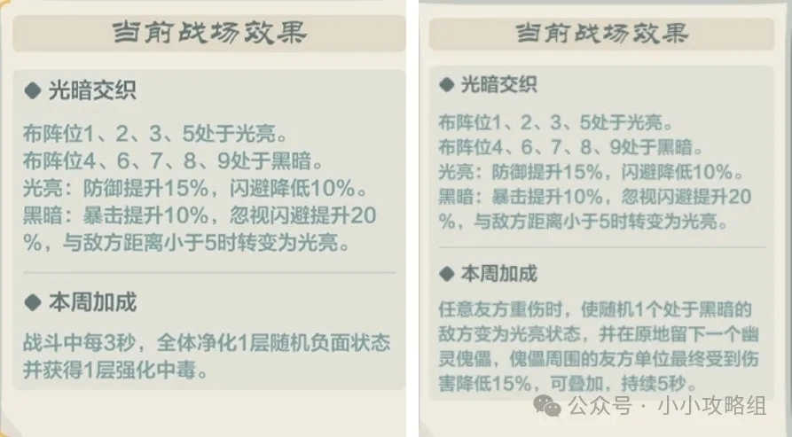 分两类情况:一种是整个赛季都固定不变的本周加成,这种赛季固定的设定,感觉对当下流行的舞狮阵容(三前排搭配三后排)有点针对性。另一种则是每周都会更新的本周加成,各位大侠可得留意这一点。